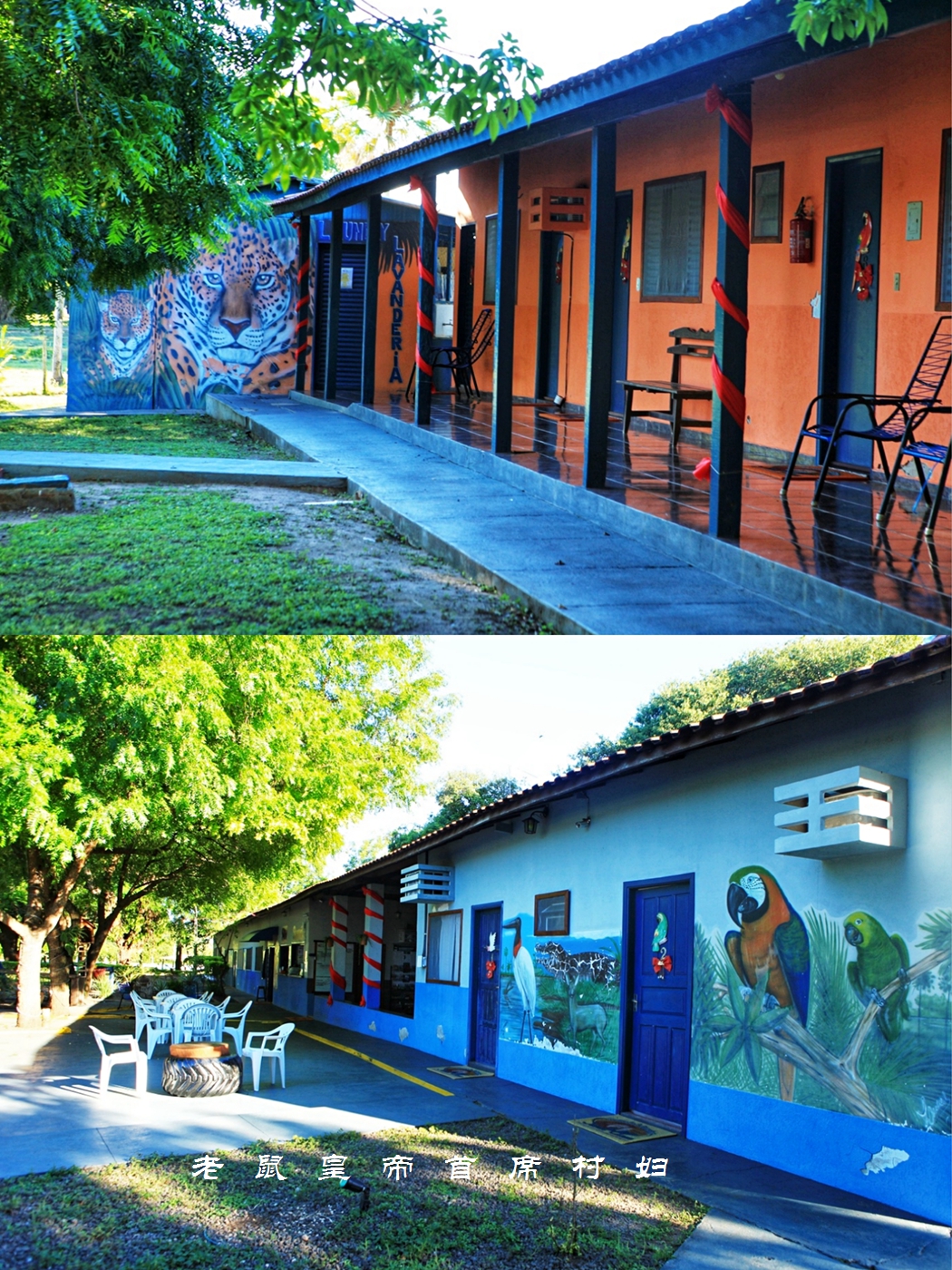 第三,全部都是大平层,客房有两排,一排刷成蓝色,一排刷成焦糖色,墙面画的是湿地动物圈,颜色很灿烂,是巴西人热情的写照。我们定的是自带卫生间的标房,设施俱全,质量一般。
