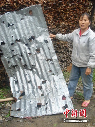 “当时是凌晨4点多钟,我听到楼上哐哐响,赶紧爬上二楼,没想到楼上满地是碎瓦片和冰块,我马上叫醒其他人。幸亏在深夜,没人被砸伤,要是在白天,非伤到人不可。”村民吴韶群犹有余悸地向记者描述冰雹袭击时的情景。