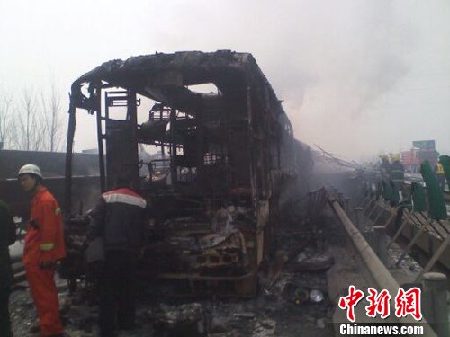 http://img1.gtimg.com/news/pics/hv1/221/38/1000/65034911.jpg已致6死32伤" />事故现场一辆大客车几乎被烧毁。邵国栋摄