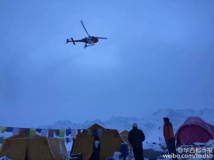【直升机接走珠峰南坡3名重伤员】珠峰陆续出现4次雪崩,滞留在南坡大本营的登山者几乎彻夜未眠。一架稍早前进入珠峰南坡的救援直升机接走了三名重伤员。记者