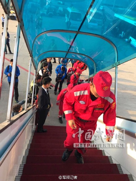 【救援信息】26日7时10分,中国国际救援队医疗分队全体队员正在登机。将飞赴尼泊尔执行抗震救灾任务#尼泊尔地震#。(#军报快讯# 程莹
