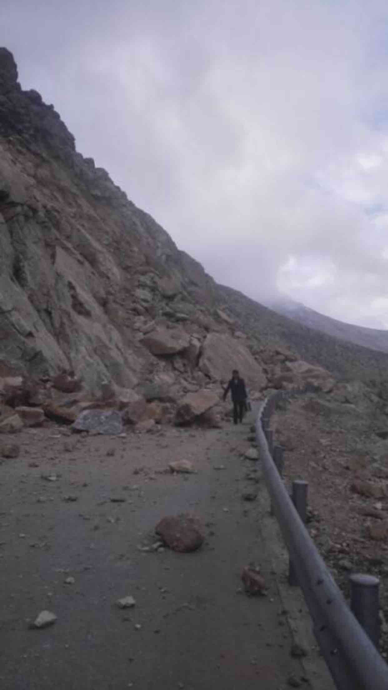 【惊险!余震落石险些砸中执勤民警】26日15时25分,尼泊尔发生7.1级地震,西藏日喀则市聂拉木县震感强烈。正在距聂拉木县5公里处318国道执行疏通任务的两位民警险些被震落的滚石击中。318国道路边地面出现近10公分裂缝。(郑永波
