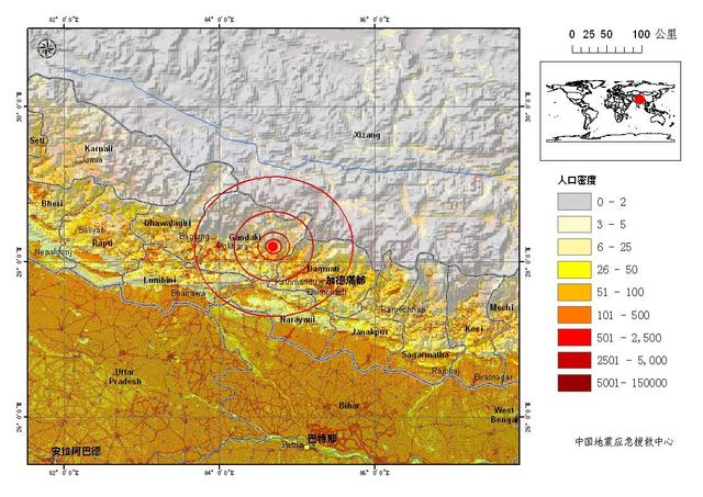 据中国地震台网信息:北京时间2015年04月25日14时11分,尼泊尔发生8.1级地震,震中位于东经84.7度,北纬28.2度,震源深度约20公里。震中半径100公里范围内城市及人口情况如下:
