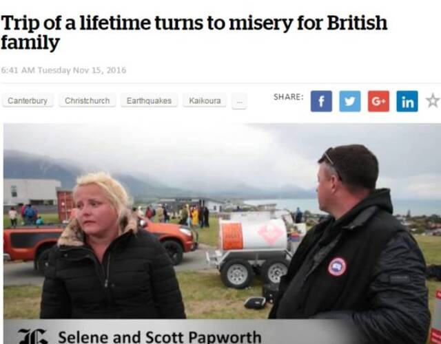 后来这对英国夫妇终于自己想办法上了一架飞往基督城的直升机,远离了地震。《新西兰先驱报》报道了这个家庭,称“他们的新西兰之旅结果是个悲剧”。