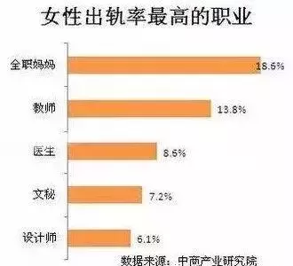 2017年刚刚过去,而根据中商产业研究院的数据报告,全职妈妈是女性出轨率最高的职业,出轨率是18.6%,其次是教师13.8%,医生8.6%,文秘7.2%,设计师6.1%。