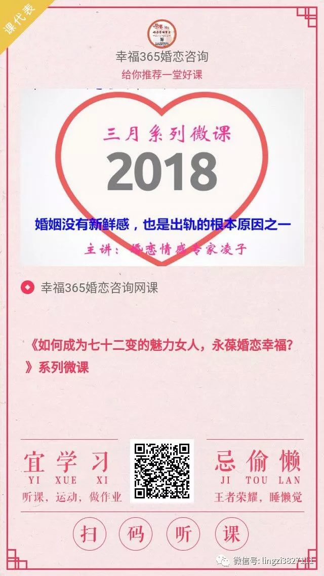 幸福365婚恋咨询平台,由婚恋情感专家凌子老师带领的咨询师团队,只提供恋爱、婚姻两方面的专业咨询。公众号lingzi3827111,个案咨询预约微信18069805680。直接按下图二维码可以听微课。