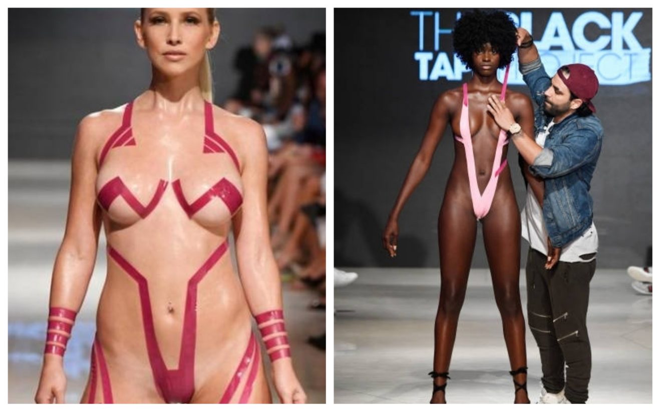 有点类似人体彩绘,胶带穿到了时装模特身上。新颖的创意简洁的泳装穿戴身上,具备各种款式。七月份的第一周由黑带项目品牌首次展示在T台上。