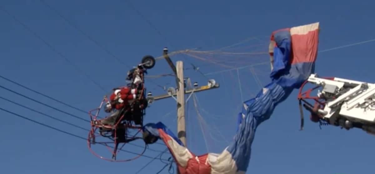 加利福尼亚12月21日圣诞老人跳伞挂电线幸被救下。多亏了救援者他才安全落地。下文看看如何施救。