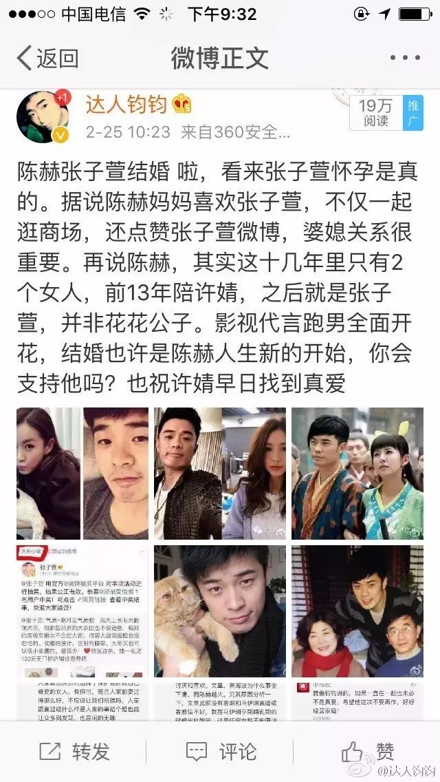 今天达人钧钧的公众号破例只推送陈赫这一篇文章。第一,在今天娱乐圈没有比陈赫生子更重大的事;第二,很多笔墨都浪费在这篇文章上了。突然觉得我改天可以除了八卦可以写写情感。就像那些年被骂过的赵雅芝,抛弃前妻猛追邓婕的张国立,被马蓉和经纪人戴了绿帽子的王宝强……生活中很多很多这样的例子。成熟的人思考一下,其实感情这东西对错真的不好说,爱也不是一辈子的,很多时候是亲情和孩子在维系。那些结了婚的人也许在婚后才遇到一辈子的真爱,然后离婚再结婚,被周围的人骂死,直到他们白头偕老才被祝福。并没有对错,只是希望年轻人恋爱的时候不要冲动结婚,也不要偷吃禁果,因为孩子和并不是真爱的人生米煮成熟饭。钧钧希望大家都成熟些,对自己人生走的每一步路负责人,想好了再走。人生没有回头路,走错了不管是刀山火海你也要走过去直到尽头。希望大家都能够有完美的人生旅途。今天就酱紫!