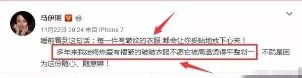 一天后,马伊琍发微博:多年来我始终热爱有褶皱的破破衣服不愿它被高温烫得平整划一,不就是因为这份随心、随意嘛!