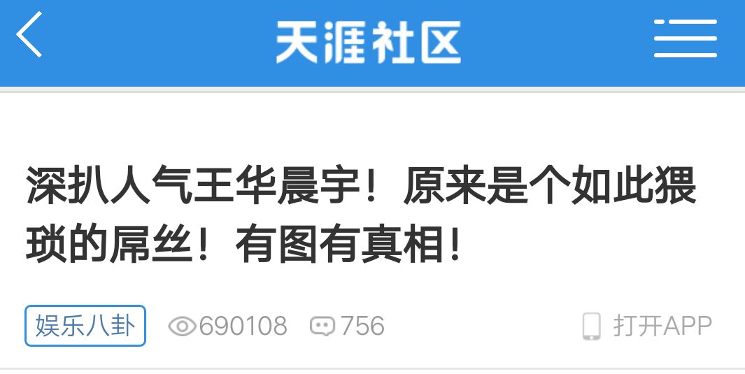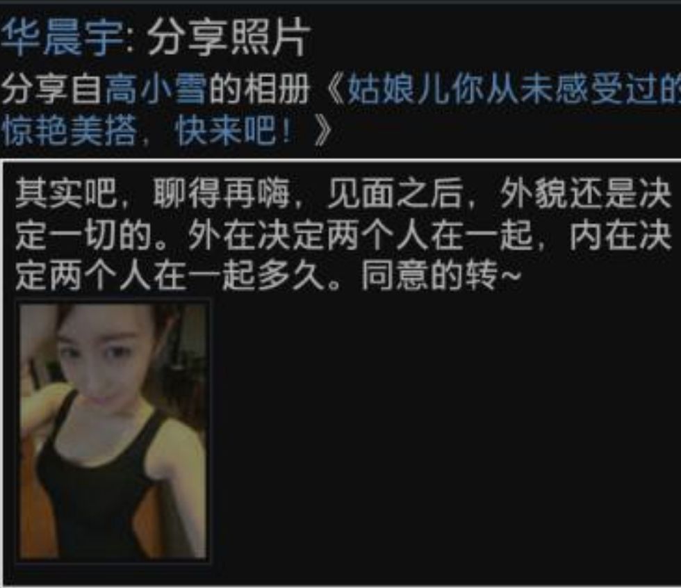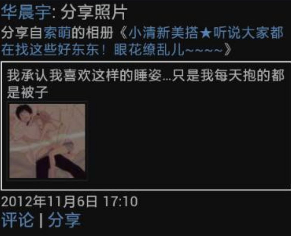有人在天涯社区发表了题为《深扒人气王华晨宇!原来是个如此猥琐的屌丝,有图有真相》,阅读量有近70万,文中列出了许多华晨宇的空间分享。当然叫华晨宇的不止一个,别问为什么是这个华晨宇,网友的眼睛是雪亮的!