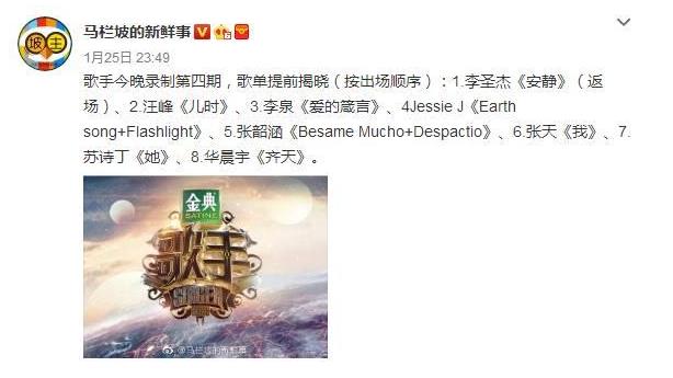 目前歌手第四期已经录制,歌单也被多数网友提前爆出,(按出场顺序):1.李圣杰《安静》(返场)、2.汪峰《儿时》、3.李泉《爱的箴言》、4Jessie J《Earth song Flashlight》、5.张韶涵《Besame Mucho Despactio》、6.张天《我》、7.苏诗丁《她》、8.华晨宇《齐天》。