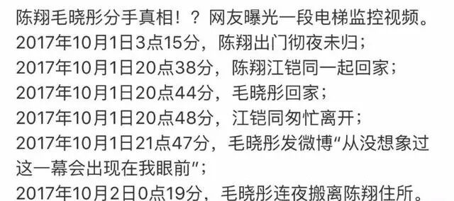1月25日深夜,有网友曝光了一个视频,这个视频疑似指明陈翔劈腿江铠同。视频显示,2017年10月1日晚,陈翔先后与江铠同共同乘坐一个电梯回家,几分钟后,毛晓彤结束工作突然也回到了陈翔家里。4分钟后,江铠同仓皇离开,而毛晓彤则发布了那条意味深长的微博。之后,毛晓彤凌晨连夜搬离陈翔住所。