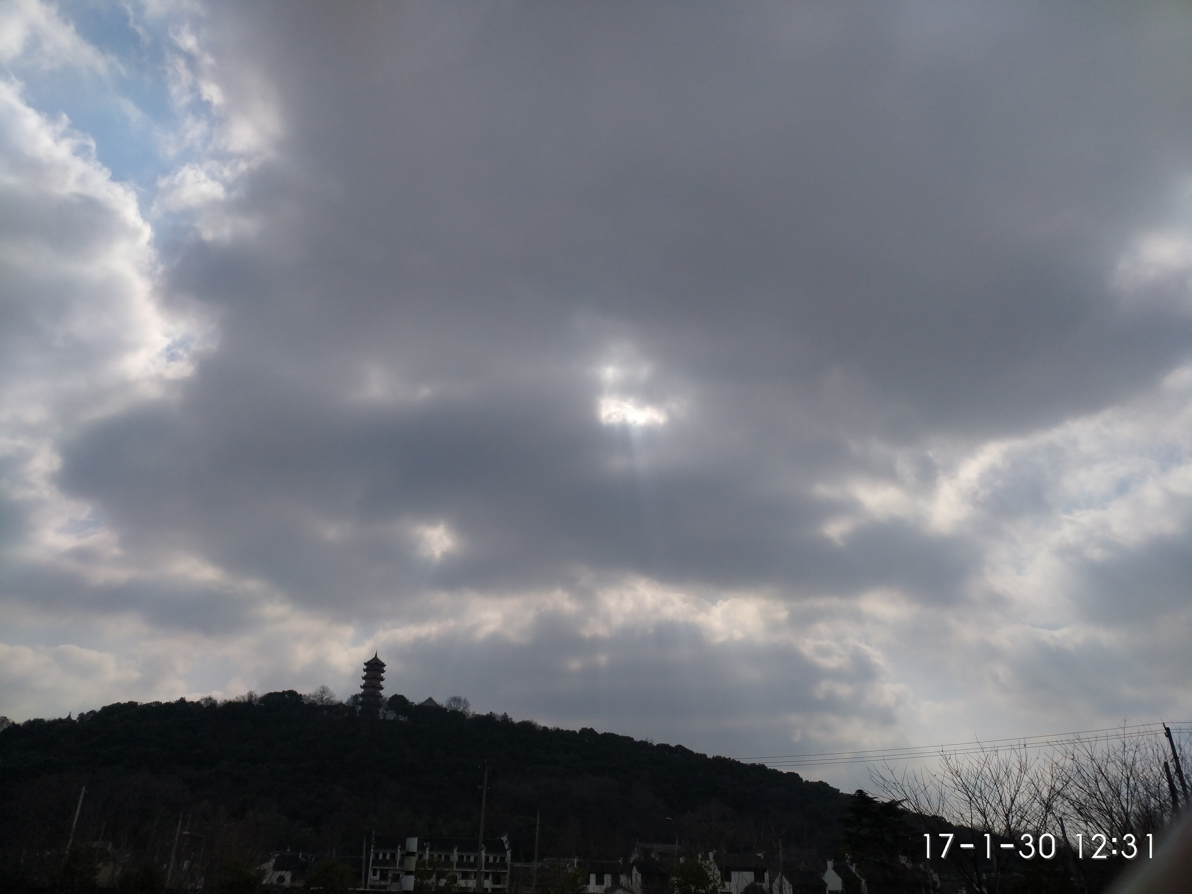接下来参观了泥人生产厂家。比路边小店贵多了。在院子里看到了阳光穿云。昨天是照在水上,这回是照在山上。
