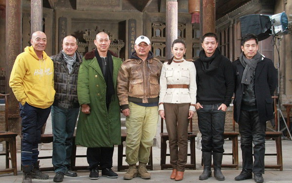 导演王全安(中)带《白鹿原》原著作者陈忠实(左二)看戏场置景。