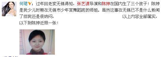 演员何珺在微博上爆料称,过年回老家无锡得知,张艺谋导演和陈婷在国内生了三个孩子。此外,她还称陈婷是其少儿时期在无锡巿少年宫舞蹈班的师姐,并在微博上附了陈婷的近照。此言论一出,立刻引起轩然大波,圈中人及网友均对此持以怀疑态度。针对此,今日何珺再次在微博上发言,称自己只是一个小演员,对方为大导演,发微博的目的只是希望能让事实真相多留一会。