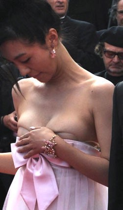 在戛纳闭幕式上,李菲儿身着蝴蝶结粉色抹胸裙,十分可爱。而当走到红地毯一半的时候,裙子滑落,李菲儿忙用手护住。