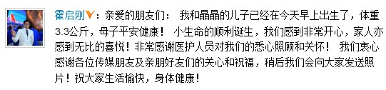 8月27日,霍启刚在微博报喜,称郭晶晶已于今早诞下爱子,体重3.3公斤,母子平安。并称稍后会发布照片。