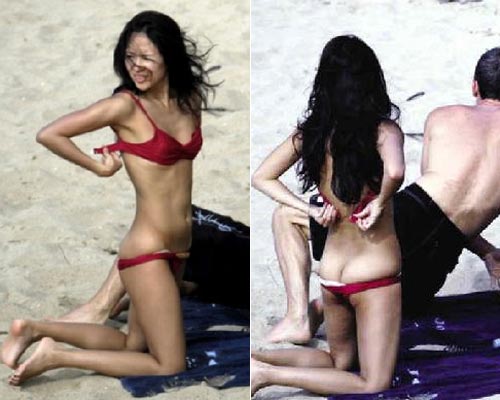 章子怡无惧同场其他度假者的目光,跪在未婚夫身旁,迎着海风施施然脱下比基尼泳衣,赤裸上身露两点晒太阳,然后再拉低泳裤趴在沙滩上,尽情享受日光浴。在旁的未婚夫Vivi Nevo则穿着短裤,不停爱抚未婚妻,动作相当露骨。然后,Vivi Nevo再躺在沙滩上晒太阳。