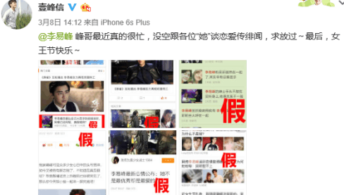 李易峰否认了,吴昕那边也不甘落后,也在网上辟谣,说她和他之间的传闻纯粹是谣言,吴昕也忙得很,又要做节目又要拍抗战戏,说她也没空谈恋爱,请大家不要再传不实谣言。