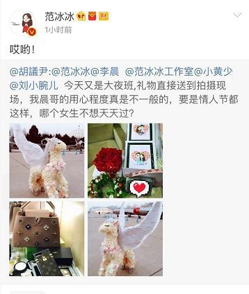 而论暴击程度伤害值最高的就是她之前发微博秀66万的手镯的事情,而在今年情人节那天范冰冰就在拍摄现场收到了李晨的礼物,从照片上可以看到,礼物数量之多,品种之繁杂,金额之大,小编简直就是一口老血都吐出来了,这样子的情人节我愿意天天过!!