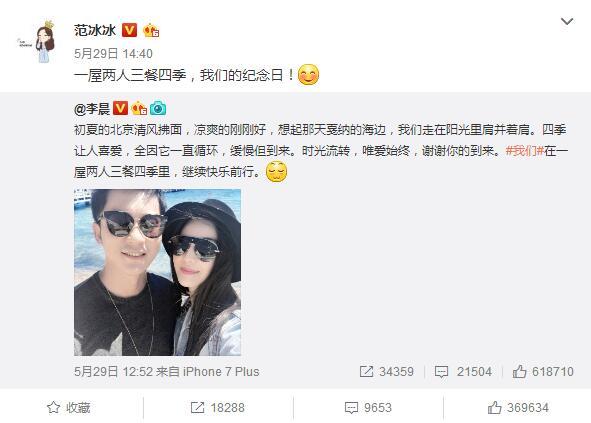5月29日,是李晨范冰冰公布恋情两周年的日子,李晨在微博晒出两人在戛纳海边的照片。