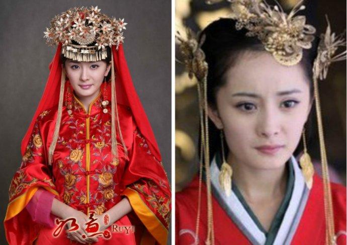 杨幂在《如意》中的新娘装扮,红火的喜服,奢华的头饰尽显贵气,展现了新嫁娘的独特之美,却少了李沁的那份甜美。在《美人心计》中的金色头饰不必提起,遮盖了杨幂的本身之美。
