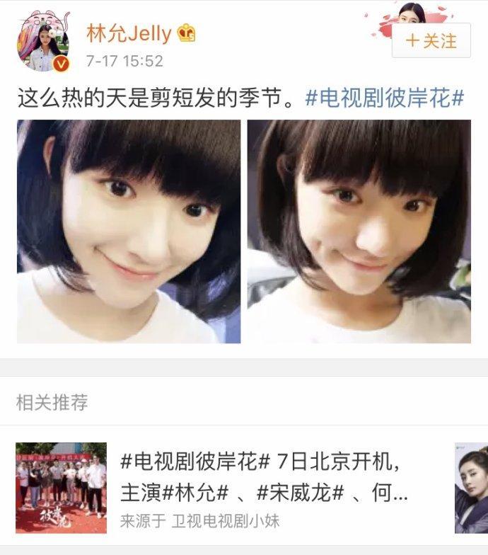 电视剧《彼岸花》近日于北京开机,主演林允首曝短发造型俏皮可爱,十分令人期待,7月17日林允在微博也晒出短发造型,有网友称简直与匆匆那年方茴神撞脸呀,更有网友说这不是艾克里里吗?