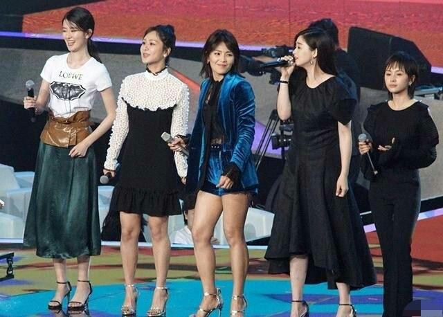 还是欢乐五美的同台,刘涛身穿黑色透视长裙,若隐若现的腿部充满性感的气息,朦胧飘逸的纱裙让人充满遐想的空间,无论是腿部还是整体依然将旁边的蒋欣对比的非常惨烈。