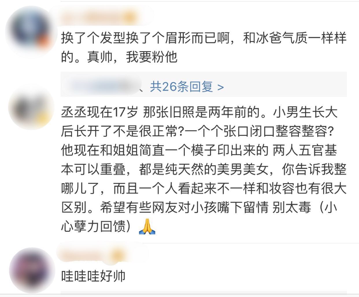 也有一些网友表示,范冰冰一家的基因本来就很好,弟弟范丞丞长成这样也很正常。况且小男生长开了,换了发型变帅很正常,旧照并不能说明什么。而且范丞丞长得跟姐姐和爸爸都很像,妥妥地打了那些说范丞丞是范冰冰私生子的人的脸!