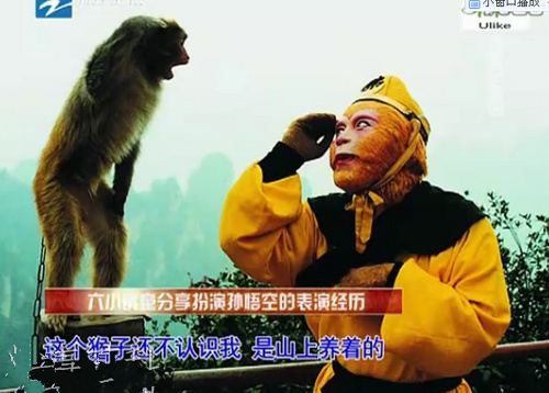他将那个猴子演得活灵活现的,因为他来自猴王世家,他的影响超越了半个世纪的人了,西游记作为四大名著之首,六小龄童版的《西游记》创造了巅峰,是一部永不衰老的经典巨作。他的孙悟空由于太过真实太深入人心了,以至于后来翻拍这部剧时,孙悟空只能以其他方式来表演,吴樾、林志颖、翁青海、曹荣、陈浩民,张卫健,等人都曾扮演过孙悟空一角,但他们都只能以不同一派搞笑戏剧化来演孙悟空,这也说明六小龄童版的孙悟空就是经典。图上为一只小猴子看到他以为见到一只比它体形大的猴王,给他敬礼,六小龄童也给它回了个礼,就有了这张超有爱的图片,这张照片当时还拿了摄影界的国际金奖。