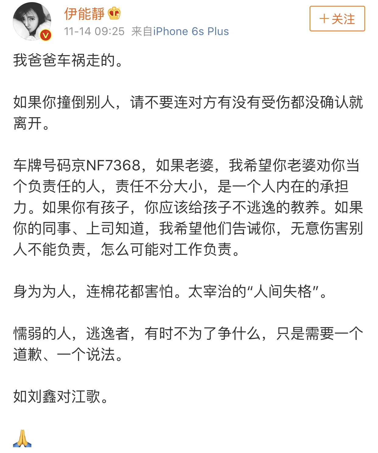 在今年十一月秦昊发生车祸时,伊能静也发了微博表达了对老公的支持。