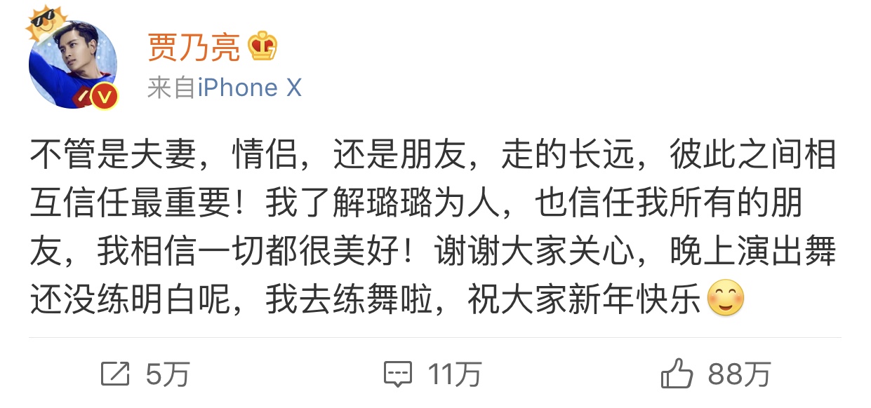 1、李小璐出轨谣言传出以后,贾乃亮就做出了这样的辟谣声明,一字一句十分感人,也可以看出来他对李小璐深深地感情和信任。