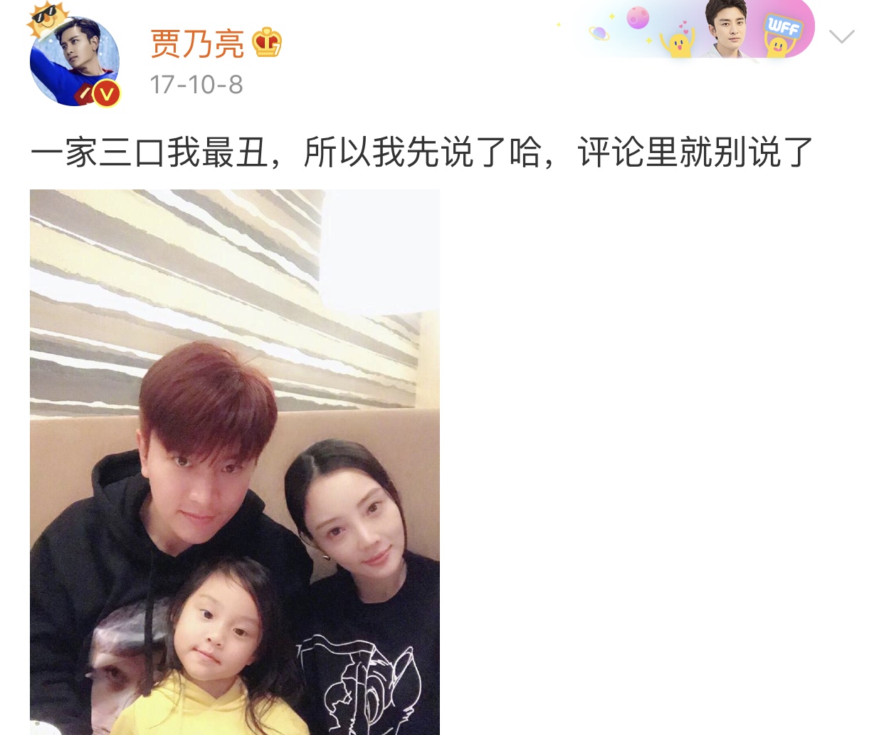 4、在一些小细节上,也可以充分看出来贾乃亮的用心。比如在十月份的时候,贾乃亮发了一条“一家三口我最丑”的微博,既晒了娇妻又晒了闺女,一家三口其乐融融。