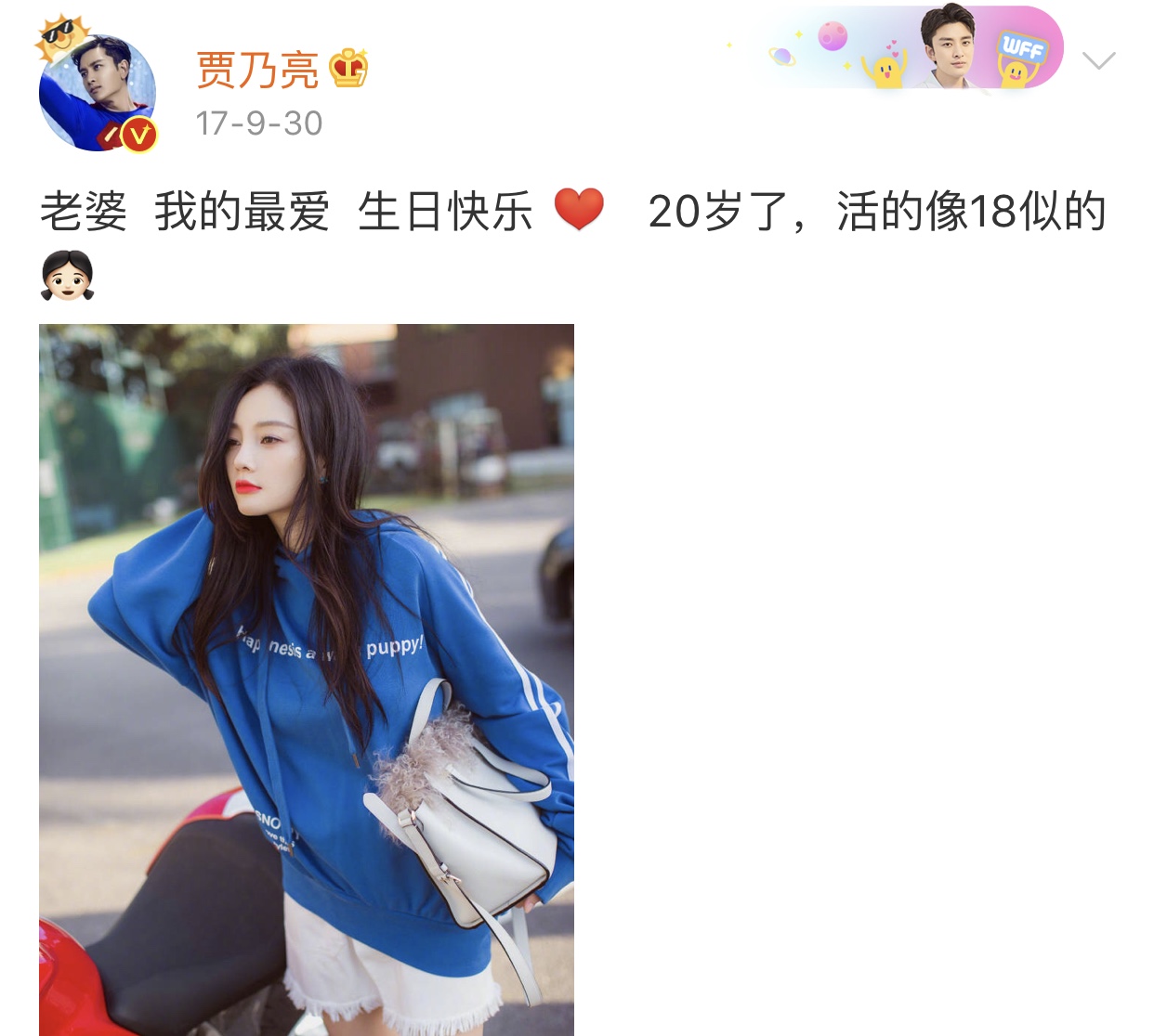 5、在李小璐生日时,贾乃亮在微博上贴出了老婆的美照,表达了对李小璐满满的爱意。可以看得出,两人生活中感情十分好,贾乃亮的嘴也十分甜,相比这也是李小璐爱上贾乃亮的一大原因。