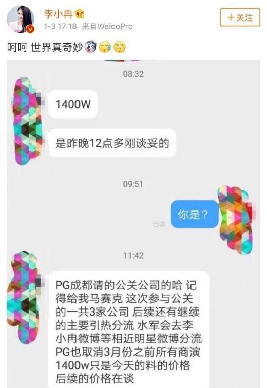 不过也有人指出,这是为了分流,让网友们的注意力不在李小璐身上。不得不说,这招真高!李小冉也在微博上晒出了公关公司的对话截图,来表示抗议。而目前这条微博已被李小冉删除。