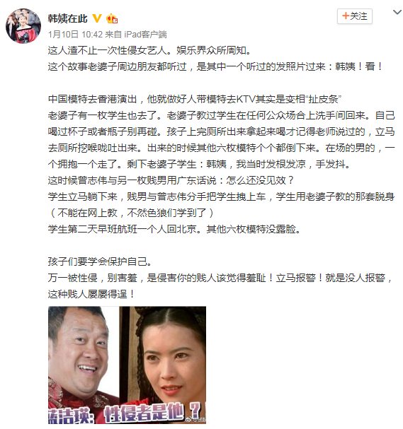 而微博中认证为金牌女模教母的韩颖华,发文爆料曾志伟“不止一次性侵女艺人,娱乐圈都知道”,并且做好人带八名女模特去KTV,实则是借机“扯皮条”。刚巧其中一名女模特在它的学生,她用方法侥幸逃过了曾志伟和其他男子的迷奸,随后没再见过其他七名女模特。到目前为止,曾志伟方面对此事还没有回应。
