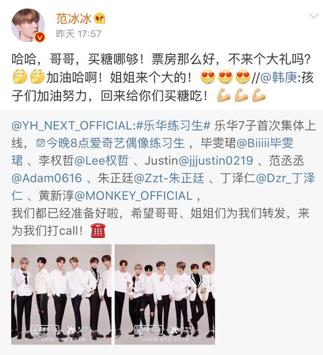 范丞丞就作为100名其中的一员,在经过四个月的训练和舞台比拼后,只能选出9位作为男团出道。范冰冰为了支持弟弟的节目,还把自己的微博头像换成了范丞丞的头像。