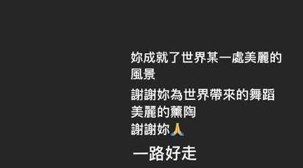 梁静茹在个人社交网站发文悼念:“你的生命为大家带来了很多美丽的画面,美丽的舞步。你成就了世界某一处美丽的风景,谢谢你为世界带来的舞蹈,美丽的熏陶,谢谢你,一路走好”,满满的不舍之情。