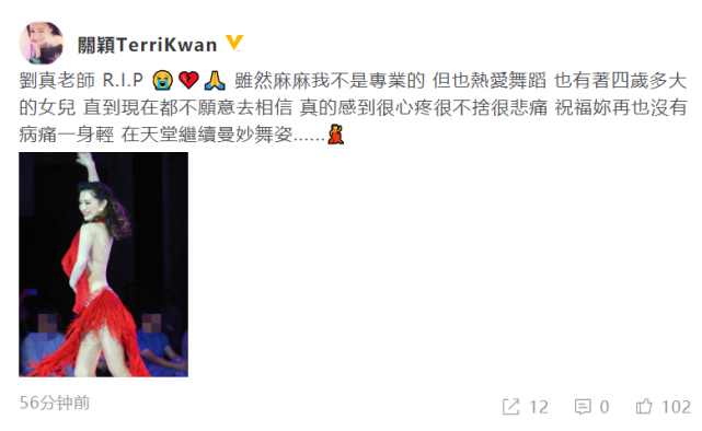 关颖在微博发文:“刘真老师,R.I.P。虽然麻麻我不是专业的,但也热爱舞蹈,也有着四岁多大的女儿。直到现在都不愿意去相信,真的感到很心疼很不舍很悲痛。祝福你再也没有病痛一身轻,在天堂继续曼妙舞姿......”,一定可以自由自在的跳舞的。