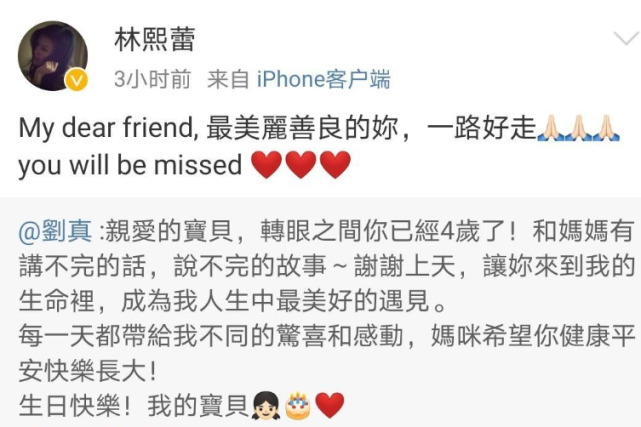 林熙蕾也发文悼念好友,她转发了刘真最后一条微博说:”My dear friend,最美丽善良的你,一路走好, you will be missed.“,我们都会想念。