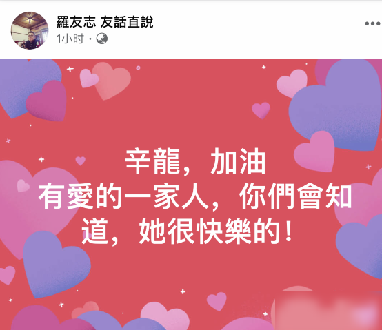 台湾名嘴罗友杰在社交平台上鼓励刘真的老公辛龙“辛龙,加油,有爱的一家人,你们会知道,她很快乐的!”其实永远都是被留下的那个人最苦,因为他不仅承受着妻子的离去,还要安抚孩子的情绪,所以真的要好好加油。