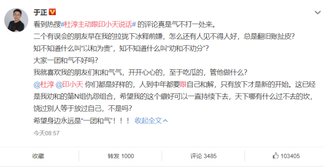 虽然印小天和杜淳在节目中的互动上了热搜,但双方本人都没有站出来做任何的回应,倒是喜欢凑热闹的于正表示有点坐不住了。说杜淳和印小天两个人私下早就和解了,背后就是于正牵的线。除此之外,还表示这已经是他劝和的第N对仇怨组合了。
