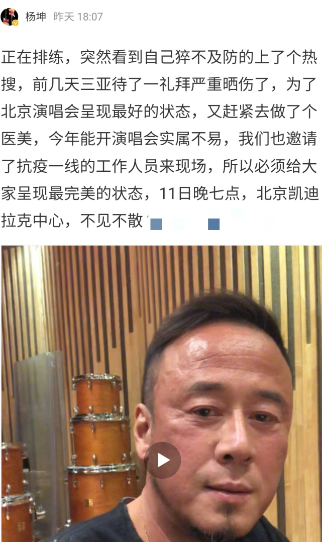 面对网友铺天盖地的质疑声,杨坤并没有在第一时间出来澄清。直到关于他疑似喝酒的事上了热搜后,他本人发了一条视频对此事作出了回应。称自己并没有喝酒直播,而是自己去三亚玩的时候把皮肤晒伤了。为了不影响工作,还特意去做了医美。除此之外,还表示自己现在在为今年的演唱会做准备,顺势打了一波广告。