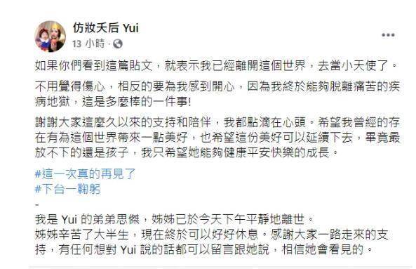 在公布的遗书中,Yui写道:“如果你们看到这篇贴文,就表示我已经离开这个世界,去当小天使了。”她让大家不用伤心,相反还要为她感到开心,因为她终于能够脱离痛苦的疾病地狱。可见,Yui已经坦然面对自己的离去。但是她最牵挂的还是只有4岁的女儿,遗憾不能陪伴她长大。最后,祝福她一路走好。