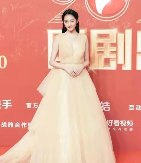 前一段时间关晓彤在某次红毯上的造型被网友们吐槽了好久,这次国剧盛典的红毯上,关晓彤终于选对了造型师。淡黄色的纱裙将关晓彤的身材缺陷修饰的非常好,更衬得她端庄大方。
