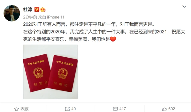 2021年的第一天,杜淳就在自己的社交平台上公开了自己的结婚证,并配文道:"2020对于所有人而言,都注定是不平凡的一年,对于我而言更是。在这个特别的2020年,我完成了人生中的一件大事。在已经到来的2021,祝愿大家的生活都平安喜乐,幸福美满,我们也是。"宣布自己结婚了,这样的消息一出来,瞬间让很多网友议论纷纷。