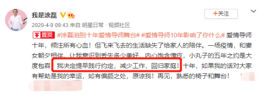 去年年初的时候涂磊退出了《爱情保卫战》这个节目,而退出的原因则是因为在《爱情保卫战》十周年特别节目中,小丸子对涂磊说,别忘了我们的五年之约。原来,涂磊和小丸子早就约定了在自己女儿五岁的时候,涂磊要减少自己的工作时间,以便用更多的时间来陪伴女儿,而涂磊为了实现和妻子的这个约定,直接退出了节目。