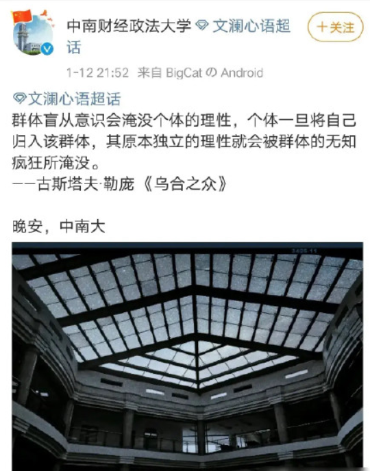 看到越来越多的粉丝在评论区留言,该学校也做出了回应,发了一段文字。这段文字是引用《乌合之众》中的一段话:群体盲从意识会淹没个体的理性,个体一旦将自己归于该群体,其原本独立的理性就会被群体的无知疯狂所淹没。但是随后却删除了这个动态。