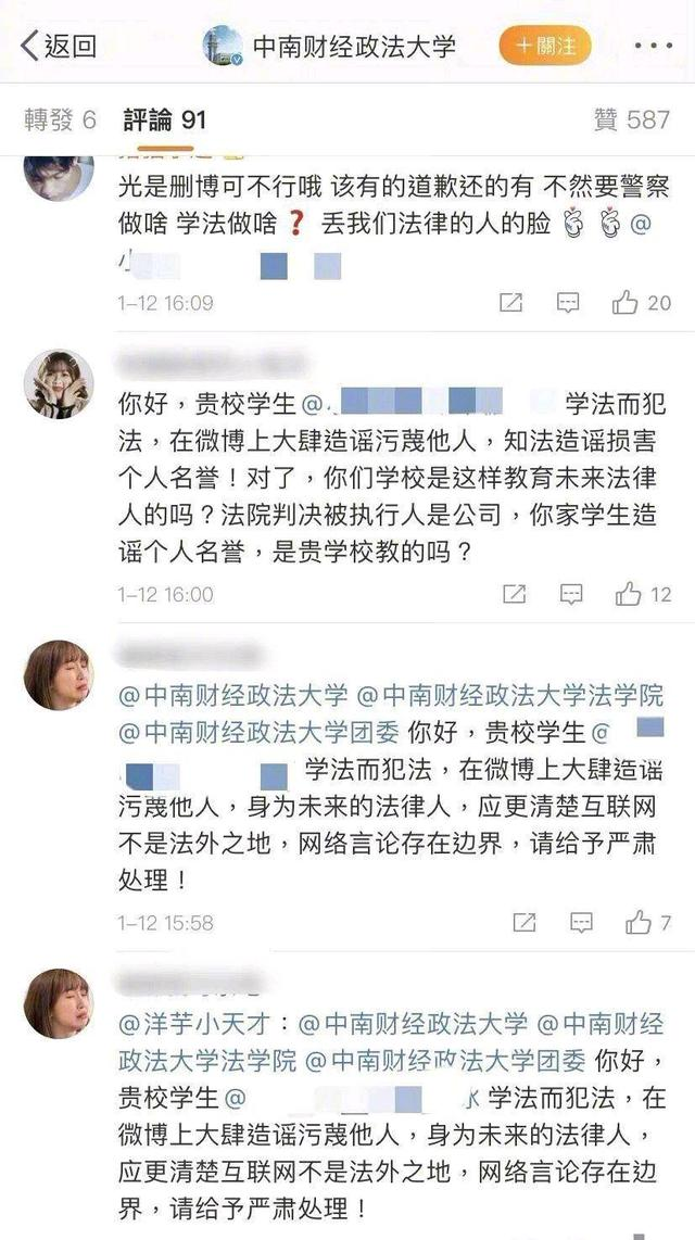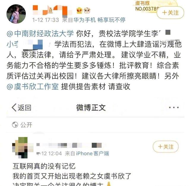 就是这条内容,被虞书欣的粉丝看到后,纷纷找到该学生的学校,并在学校的评论区留言。称要打电话给教务处举报该学生,并希望学校对其进行开除处理。甚至还有虞书欣的粉丝找到了该网友实习的律师事务所,要求辞退她。